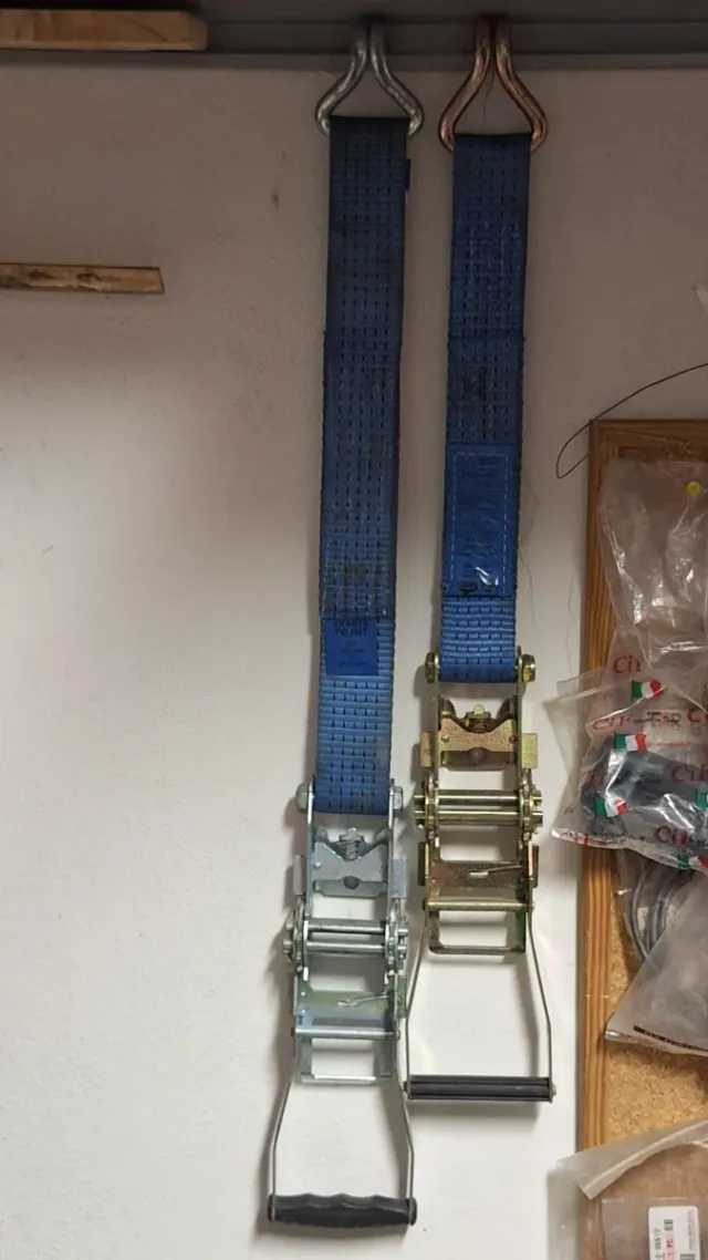 Set di cinghie a cricchetto per fissaggio. - Materiale: poliestere - Colore: blu - Meccanismo a cricchetto in metallo