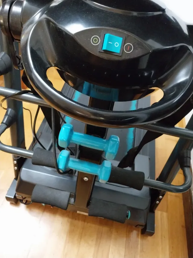 Dettagli del prodottoTapis roulant in buone condizioni, ideale per allenamenti a casa. Include un paio di manubri. Design moderno in nero e blu. Pannello di controllo con pulsanti. Maniglie imbottite per maggiore comfort. La descrizione è stata tradotta automaticamente.