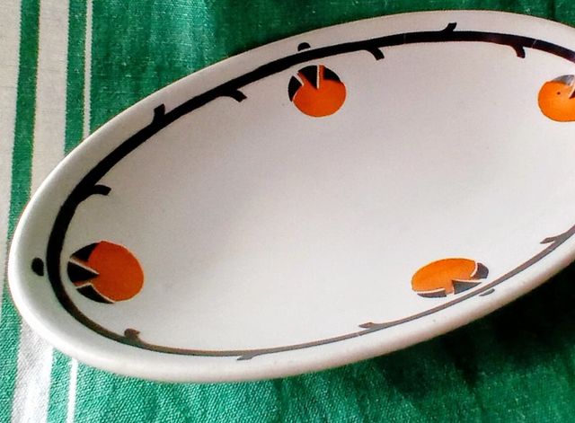 In condizioni perfette tranne una scheggiatura visibile sul fondo. Smalto lucente e colori brillanti. Nitido e incredibilmente moderno il motivo Art Nouveau in nero marrone arancione. cm 23 x 14 altezza cm 3
