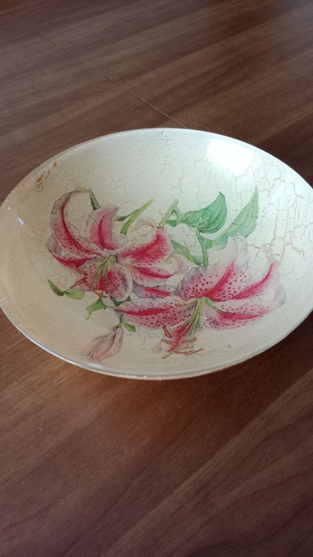 ciotola in vetro decorata in decoupage, con fantasia floreale utilizzabile come porta cioccolatini
