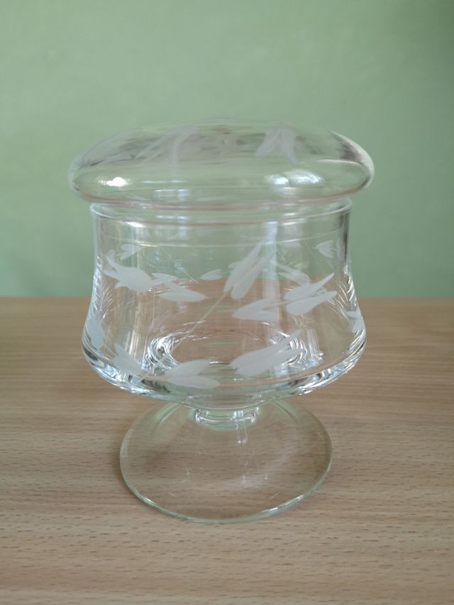 Contenitore in vetro vintage con decorazione fiori opachi e coperchio. In perfette condizioni