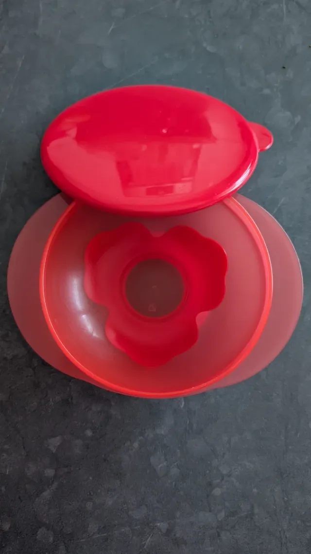Ciotola per pappa per bambini, completa di ventosa per una maggiore stabilità e tappo per conservare gli alimenti. - Colore rosso vivace. - Design con bordi a forma di fiore.