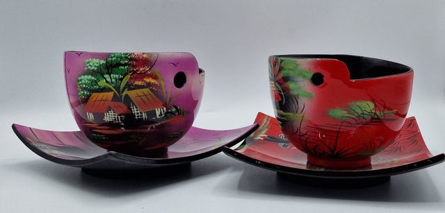 Come da foto vendo insieme 2 ciotole Giapponesi, una viola e una rossa, con decorazioni, piattino e foro per mantenere bacchetta. Mai usate, in perfette condizioni.
