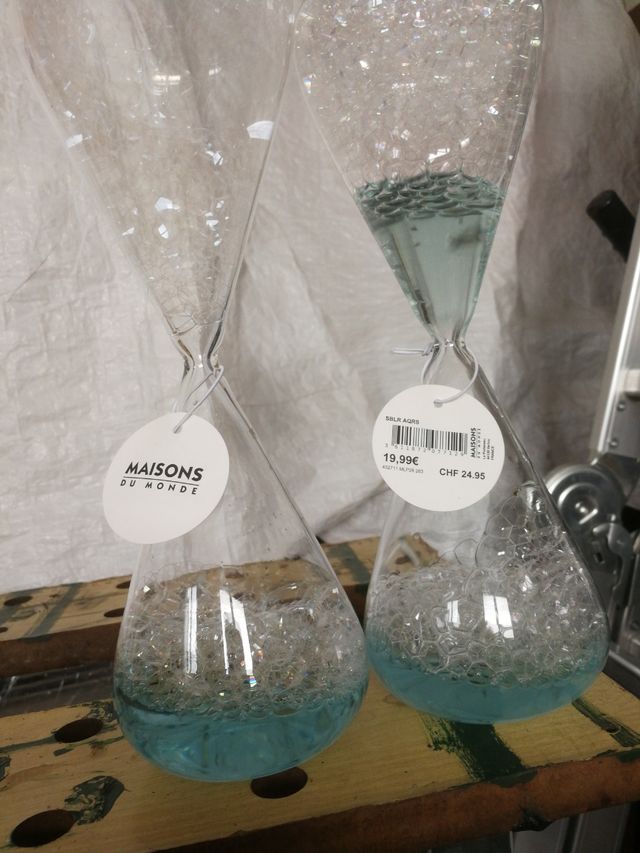Clessidre in vetro ad acqua colorata, girandole si creano tante bollicine altezza 30cm.quasi. Il prezzo è per entrambe