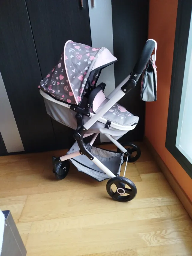 Dettagli del prodottoPasseggino per bambole con un design affascinante e pratico. - Tetto con stampa di cuori rosa e grigi. - Include borsa abbinata. - Cestino inferiore per accessori. La descrizione è stata tradotta automaticamente.