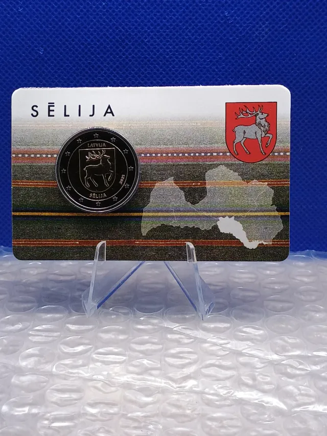Dettagli del prodottoCoincard commemorativa da 2€ della Lettonia, anno 2025, dedicata alla regione di Selija. La moneta presenta un cervo stilizzato, simbolo della regione, e il nome LATVIJA.