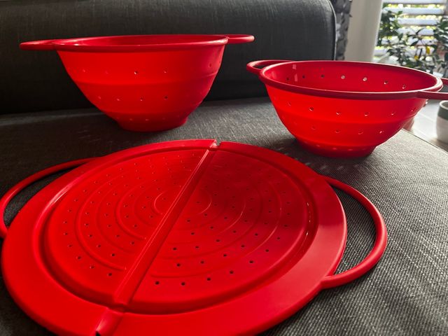 Dettagli del prodottoCola pasta in silicone 2 misure 20 e 26 + un sottopentola tutto richiudibile salva spazio. Misure del prodotto