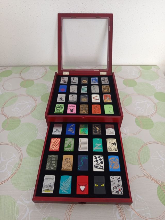 Dettagli del prodottoCollezione di 40 accendini Zippo, tutti inutilizzati. Viene fornito in una scatola doppia in mogano.