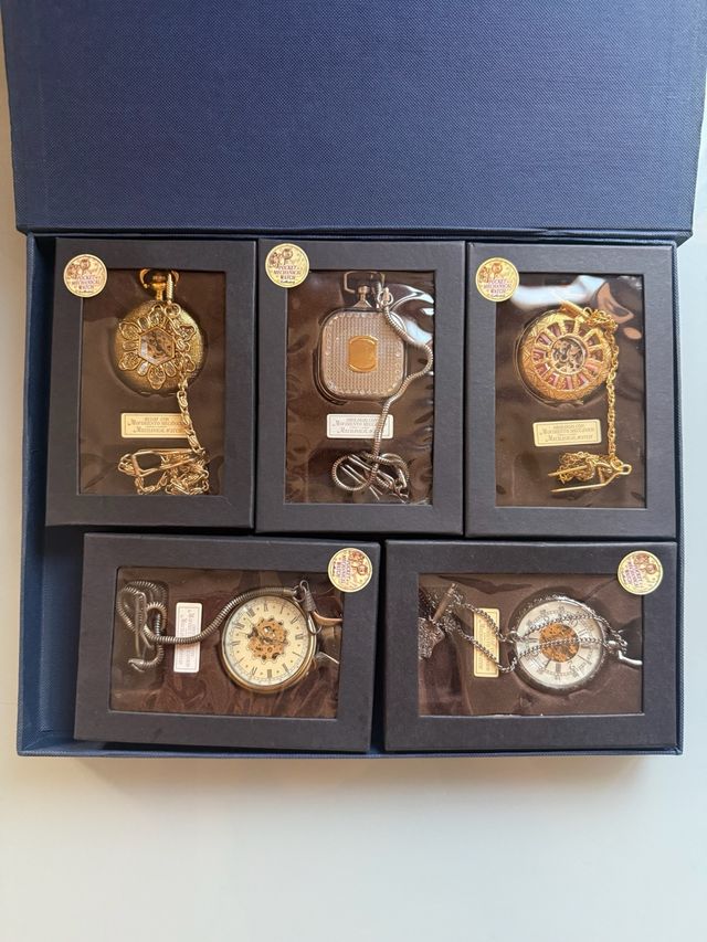 Dettagli del prodottoSet di cinque orologi da tasca in stile vintage, presentati in una scatola. Design classico. Include catene. Ogni orologio ha un distintivo finitura metallica. Aspetto elegante e dettagliato. La descrizione è stata tradotta automaticamente.
