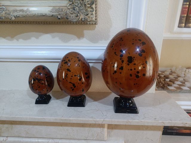 Elegante set di 3 uova decorative in ceramica smaltate di nero sulla base, il resto marrone miele con macchioline nere.