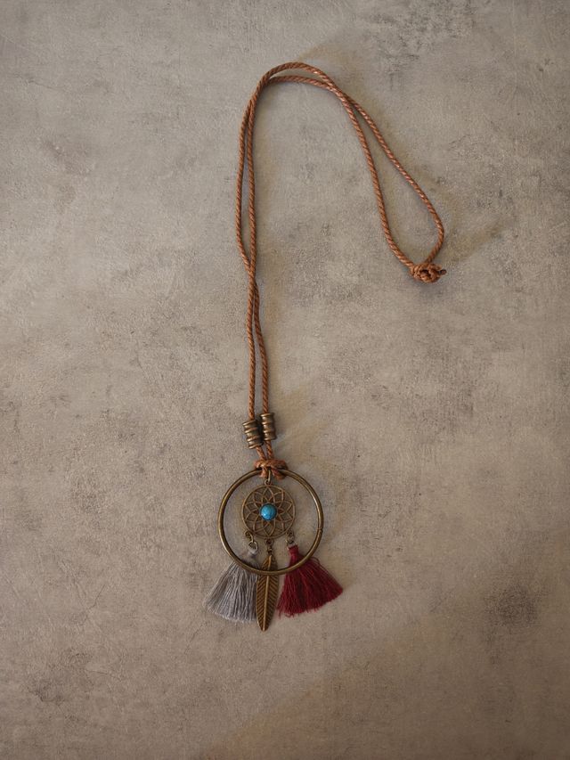 Bellissima collana dal design etnico. - Ciondolo a forma di cerchio con piume. - Cordino marrone. - Perfetta per aggiungere un tocco boho al tuo stile.