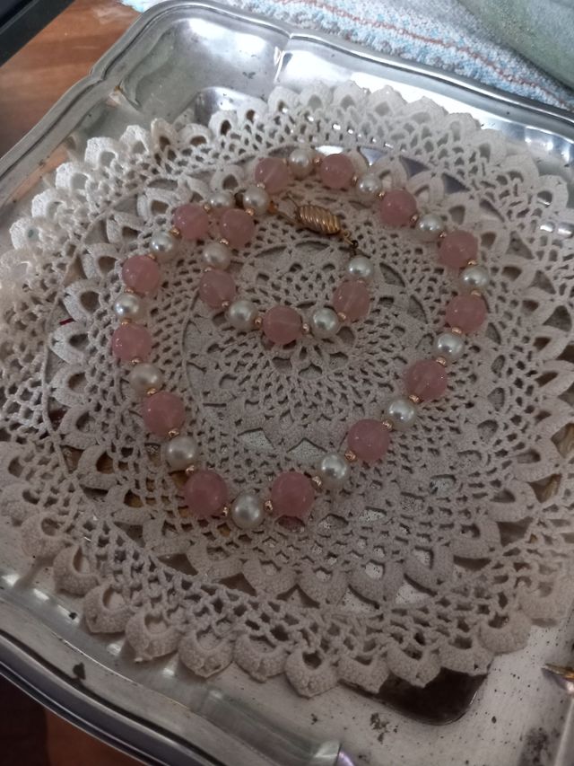 - Perle bianche lucide alternate a pietre sfaccettate color rosa.