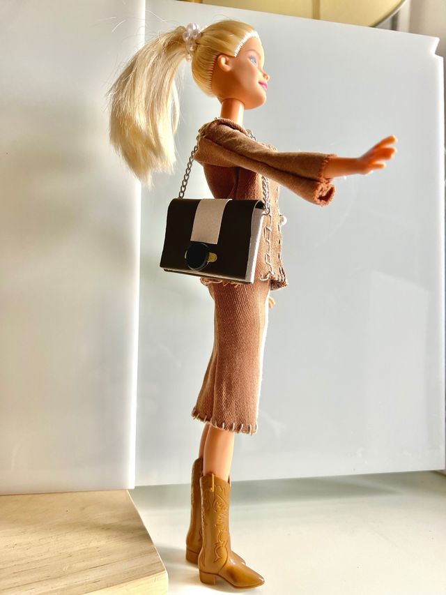 Dettagli del prodottoBorsetta per bambola Barbie fatta interamente a mano utilizzando materiale di recupero. Chiusura con clip magnetica.