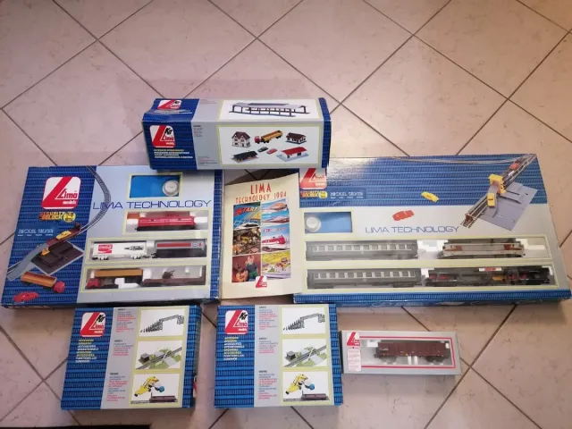 Set di modellini di treni Lima Technology. - Include diversi vagoni e locomotive. - Alcuni set includono binari e accessori.