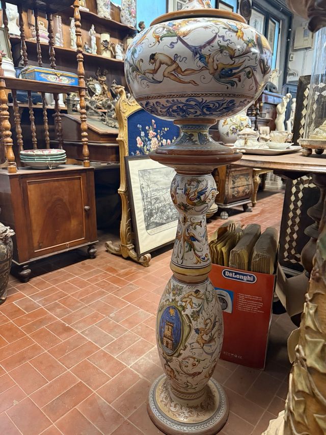 Dettagli del prodottoElegante colonna decorativa con alzatine e raffigurazioni di figure grottesche. realizzata in terra cotta. altezza 115cm