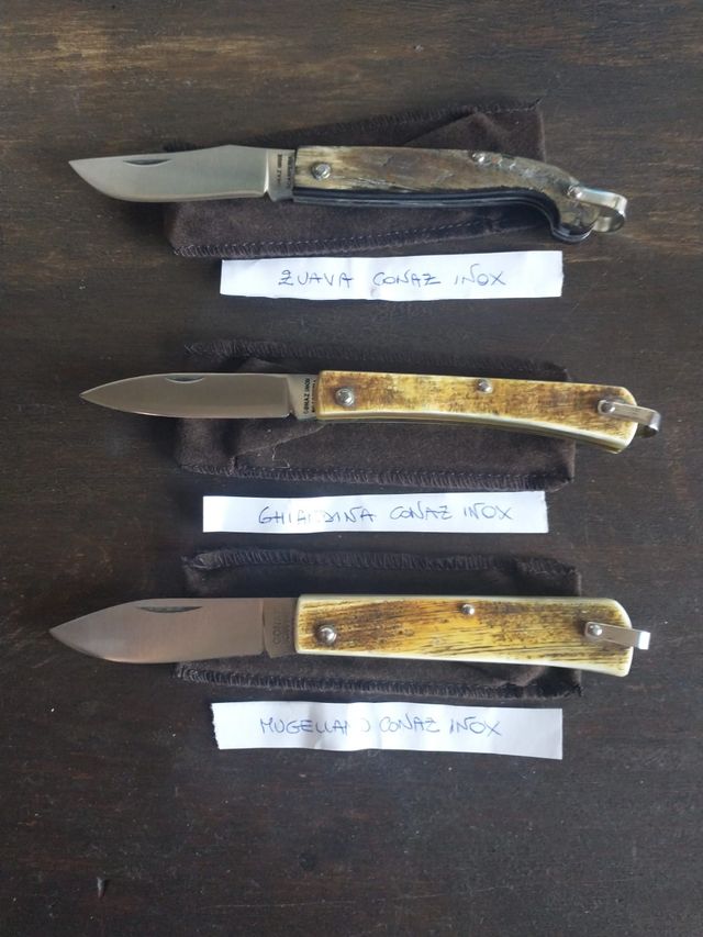 Coltelli artigianale Conaz Scarperia. Modelli: Ghiandina, Caccia Mugellano, Zuava - Manico in corno. - Lama in acciaio inox.