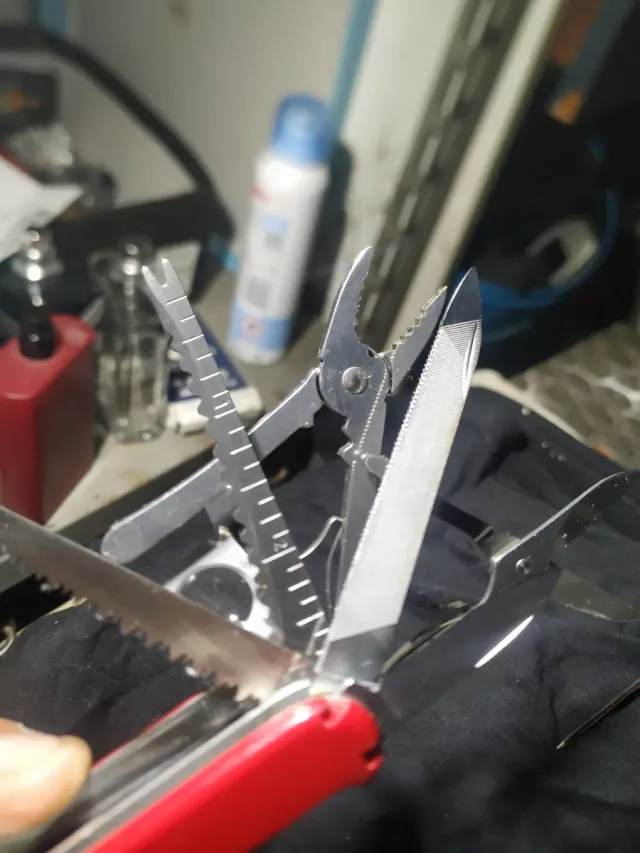 Forbici Seghetto per legno Cacciavite Phillips 1/2 ,Gancio multiuso , Lente d’ingrandimento Scalpello 4 mm Spillo Pinzette Stuzzicadenti Penna a sfera pressurizzata , Squama pesci Apribottiglie Pinza multifunzione , Apriscatole cacciavite 3 mm Cacciavite 6 mm , Sega per metallo e altre