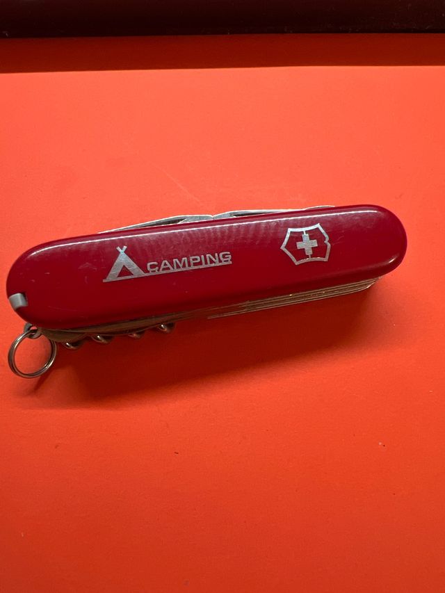 Coltellino svizzero Victorinox Ranger Camping pre 1985 - Manico rosso lucido. - Logo Camping con tenda. - Iconico scudo svizzero.