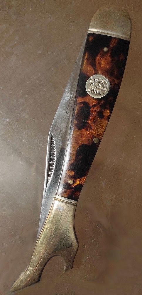 Coltello a lama inox richiudibile senza scatto con manico a forma di stivale in acciaio e bachelite tipo tartaruga Lunghezza aperto 22,5cm Chiuso 13x2. Peso 76gr