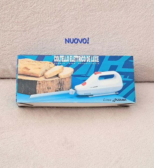 Dettagli del prodottoColtello elettrico De Luxe colore bianco con dettagli rossi. Doppia lama autoaffilante, leggero e maneggevole. Lunghezza con la lama montata cm 44. Istruzioni incluse. Marca Linea Azzurra. La scatola è lievemente rovinata, ma il prodotto è nuovo, perfettamente funzionante, perfetto!