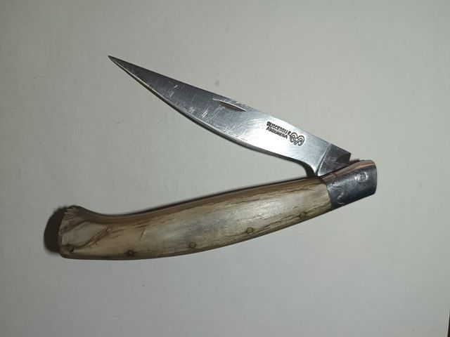 Dettagli del prodottomodello da scanno tipo Pattadese, lama in acciaio inox AISI440C, collarino in acciaio inox e manico congiunto da un’anima in acciaio che unisce le due placchette in corno di bovino.