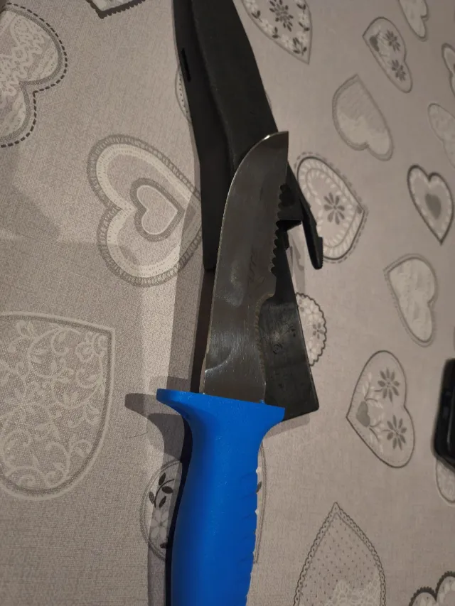 Coltello subacqueo con lama seghettata e impugnatura blu. - Lama in acciaio. - Impugnatura ergonomica in gomma blu. - Fodero incluso.