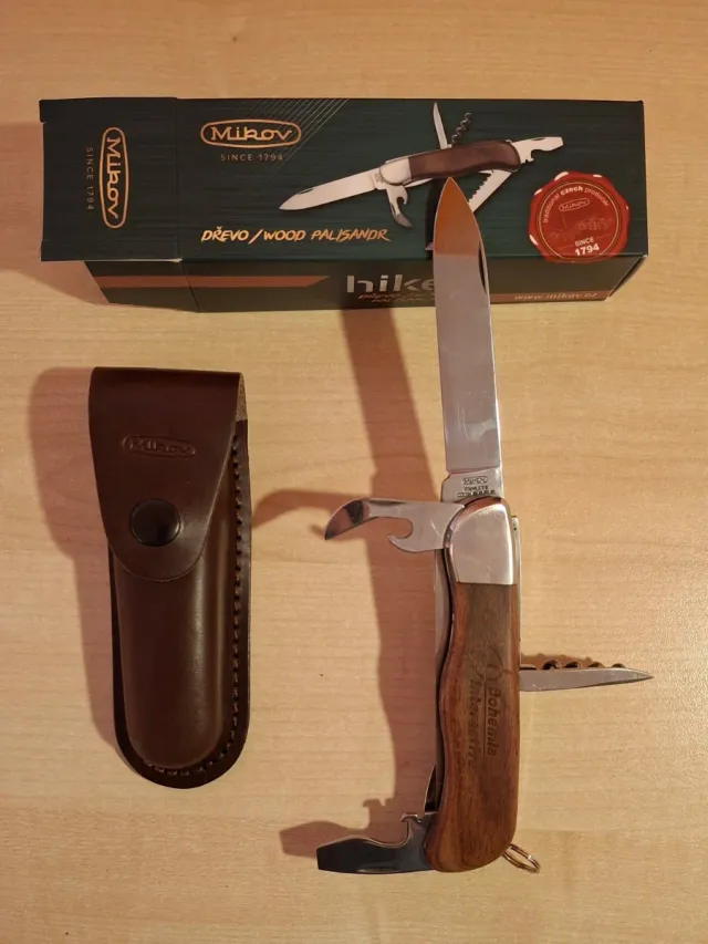 Dettagli del prodottoColtello multiuso Mikov Hiker con manico in palissandro. Nuovo senza cartellino.