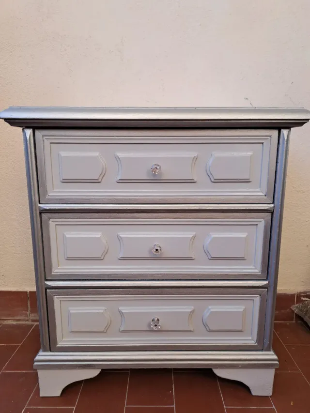 Comodino 3 cassetti bianco e argento