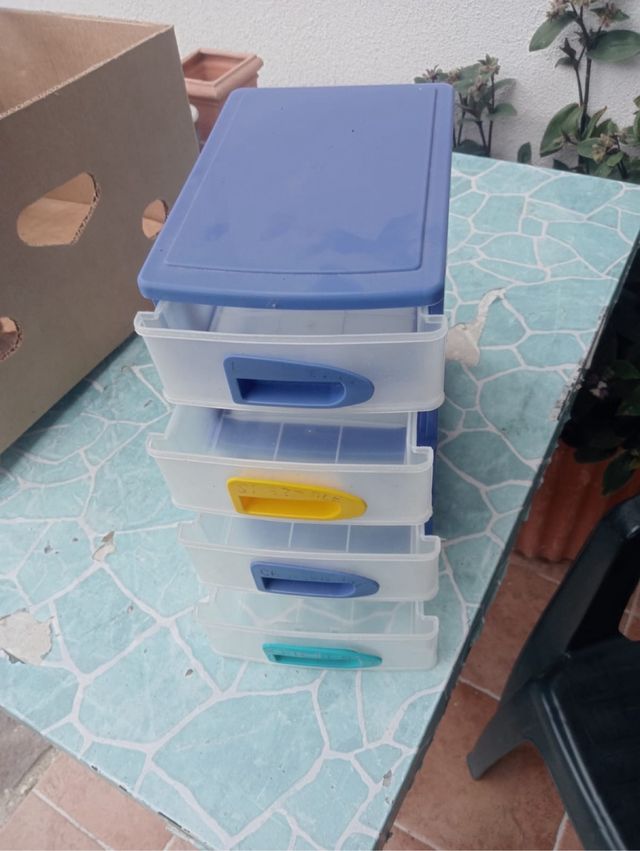 Dettagli del prodottoComodino in plastica con quattro cassetti, ideale per organizzare piccoli oggetti. È di colore blu e trasparente, ed è in buone condizioni.