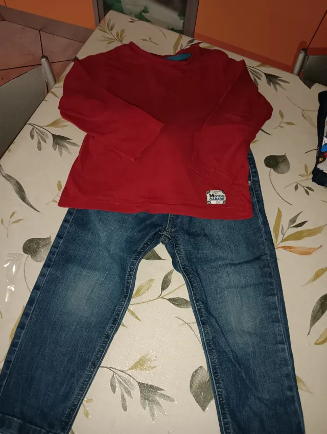 Completo per bambino composto da maglia a maniche lunghe e jeans. - Maglia rossa con stampa Motor Garage. - Jeans in denim blu.