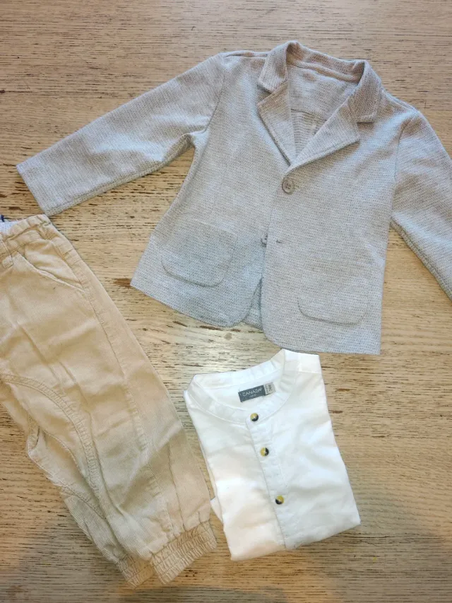 Elegante completo per bambino composto da giacca, pantaloni e camicia. - Giacca grigia con bottoni. - Pantaloni color sabbia. - Camicia bianca maniche lunghe.