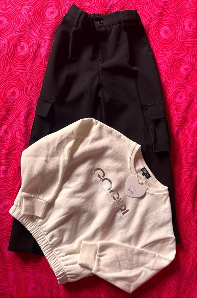 Dettagli del prodottoBellissimo completo per bambina, composto da una felpa bianca con scritta e pantaloni neri cargo. - Felpa in morbido cotone, colore bianco panna. - Pantaloni neri in tessuto liscio, modello cargo. - Perfetto per un look casual e comodo.