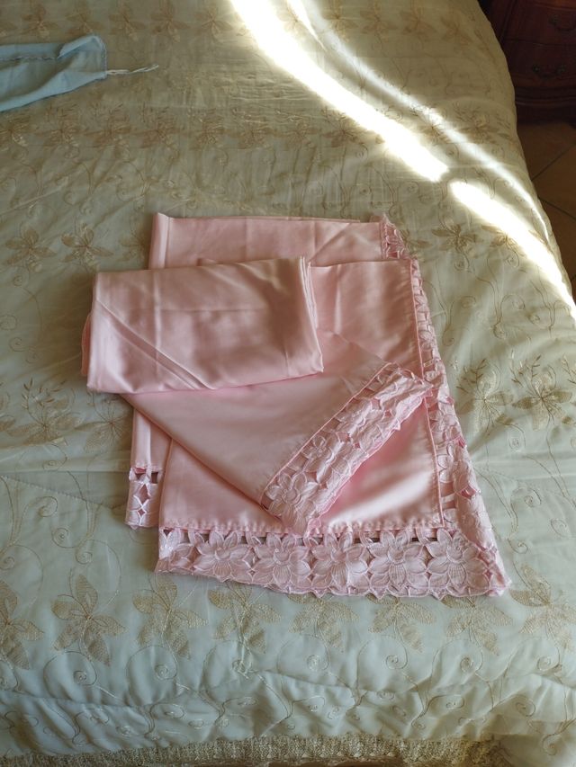 Dettagli del prodottocompleto lenzuola matrimoniale in raso rosa confetto.