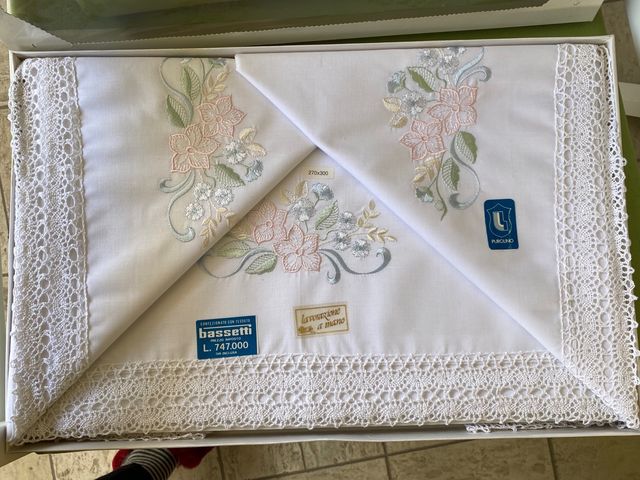 Il completo letto è uno dei pezzi di una scatola/valigia di corredo vintage. Volendo si può acquistare tutta la valigia con lenzuola matrimoniali, 6 asciugamani , tovaglia rettangolare di circa 230x140 cm con 12 tovaglioli. Le ultime foto riguardano la valigia ed altri pezzi del corredo riportanti il prezzo complessivo ed i materiali, non sono compresi in questo annuncio, solo per capire. Costo del corredo completo negli anni ‘80: 402€.
