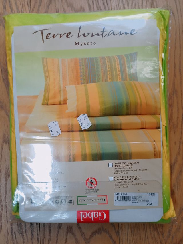 Dettagli del prodottoBellissimo completo letto singolo;lenzuolo, lenzuolo sotto con angoli, federa cuscino. colori vivaci! Tolto dalla confezione solo per fare le fotografie, nuovissimo. marca Gabel. Puro cotone.