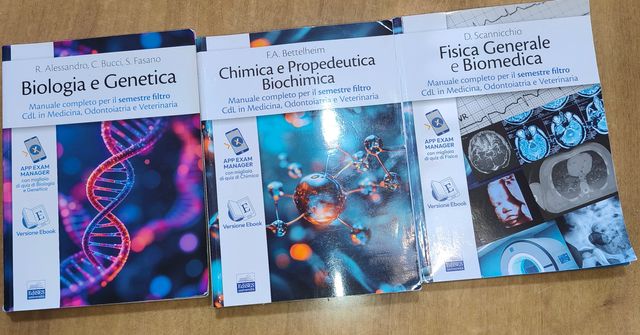 Vendo tris di manuali completi per il semestre filtro (Cdl in Medicina, Odontoiatria e Veterinaria), editi da Edises Università. I testi sono fondamentali per la preparazione degli esami iniziali e sono in ottime condizioni.