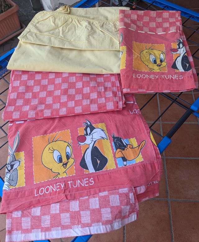 Completo da mezzo letto. Misure standard. Cotone marca Bassetti. Lenzuolo sotto con angoli+ lenzuola sopra+federa. soggetto looney tunes