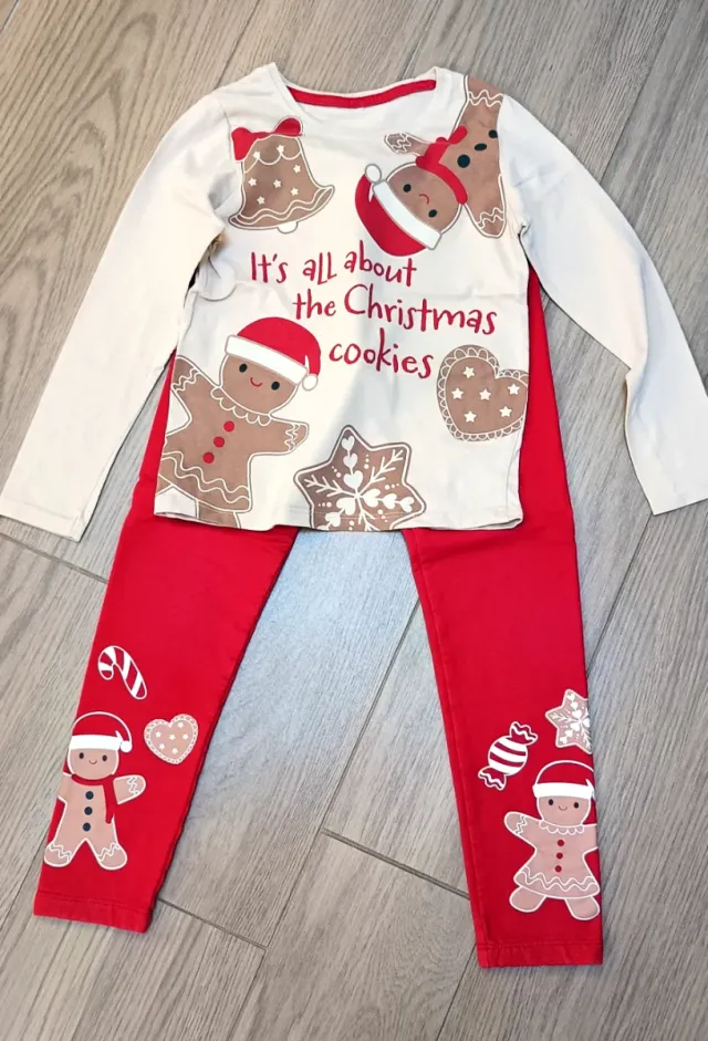 Dettagli del prodottoGrazioso completo natalizio per bambina, taglia 4-5 anni, con simpatici omini di pan di zenzero e decorazioni a tema.