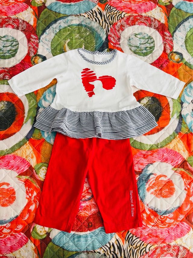 Dettagli del prodottoBellissimo completino per neonata, composto da una maglia a maniche lunghe bianca con una balza a righe blu e pantaloni rossi. - Perfetto per occasioni speciali. - La maglia presenta un'applicazione a forma di cuore. - I pantaloni sono comodi e morbidi. - Ottimo stato.