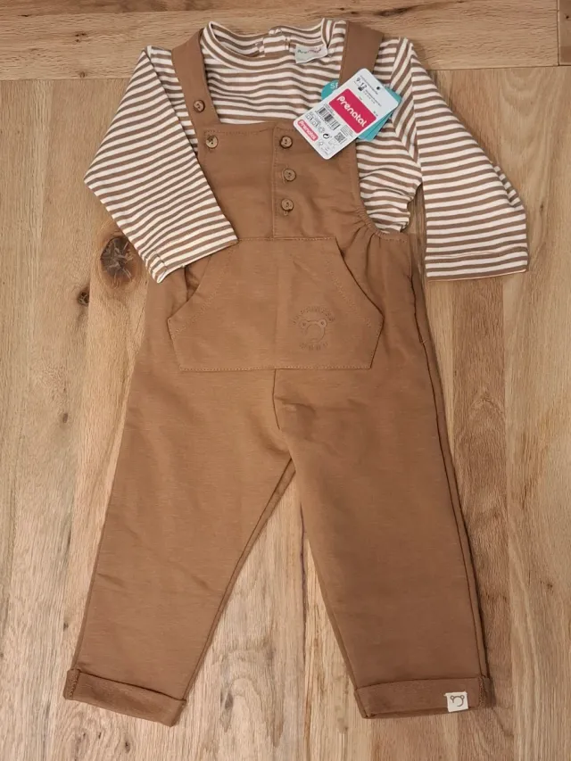 Dettagli del prodottoBellissimo completo Prenatal per neonato, taglia 9-12 mesi. Include una salopette color caramello e una maglietta a maniche lunghe a righe bianche e marroni.