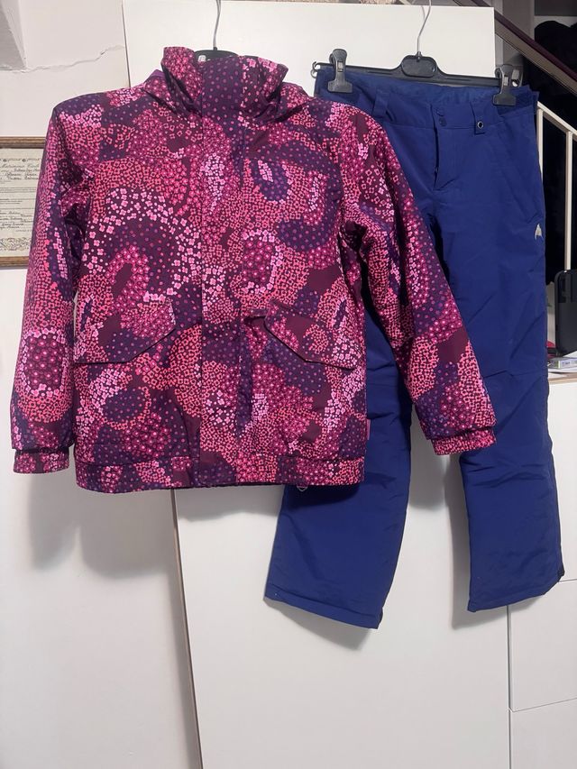 Dettagli del prodottoCompleto da sci per bambina composto da giacca con fantasia e pantaloni blu.