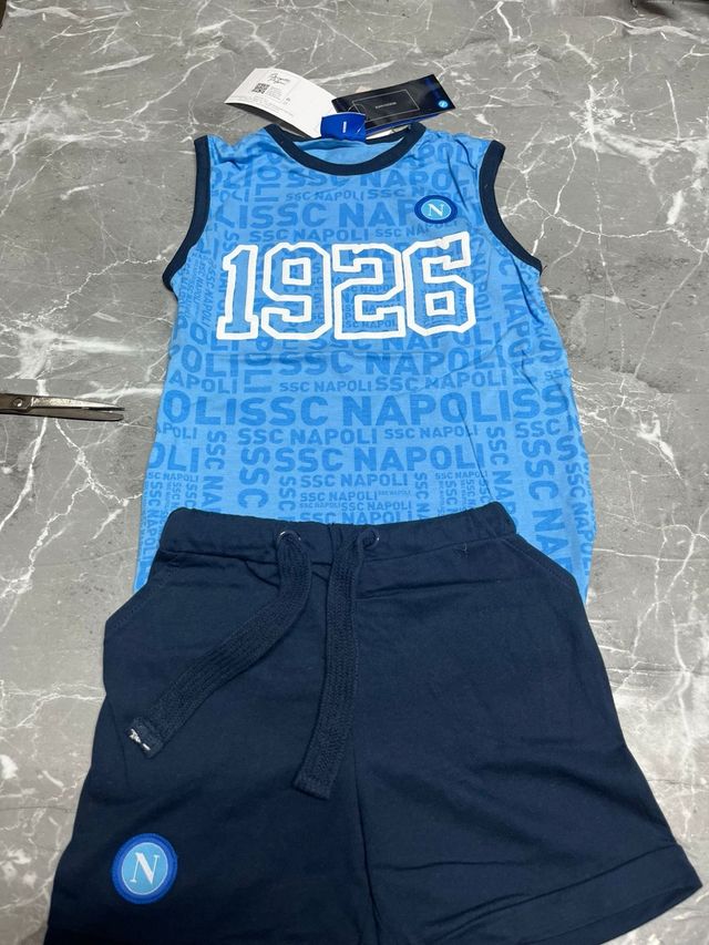 Dettagli del prodottoCompleto sportivo SSC Napoli per bambino, taglia da definire. Il completino è azzurro e blu scuro, con stampa ripetuta SSC Napoli e il numero 1926.
