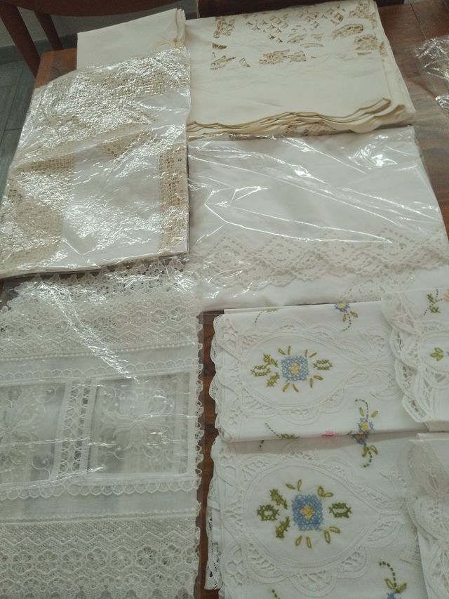 Dettagli del prodottotovaglia x12 con tovaglioli beige +2 coppie asciugamani grande e piccola ricamate a mano+ tris centri macramè bianchi+centrotavola file' rete del pescatore a mano+ centrotavola misura grande bianco a mano uncinetto tutto nuovo