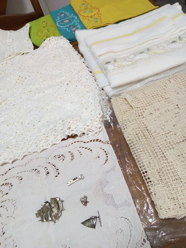 tre asciugamani,striscia uncinetto,tappeto uncinetto,coppia tendine striscia intaglio oggetti argento, tappeto file'