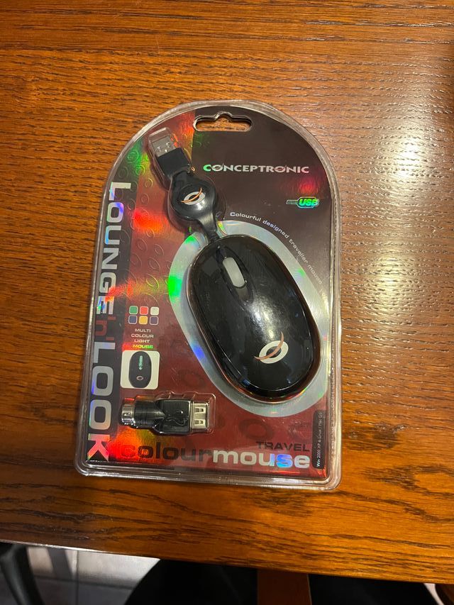 Ratón óptico para portátil con seguimiento de color preciso, cable retráctil y tamaño compacto. Cambia de color automáticamente (7) gracias a su sistema de iluminación arcoíris y es compatible con usuarios diestros y zurdos. Incluye conexión USB y PS2.