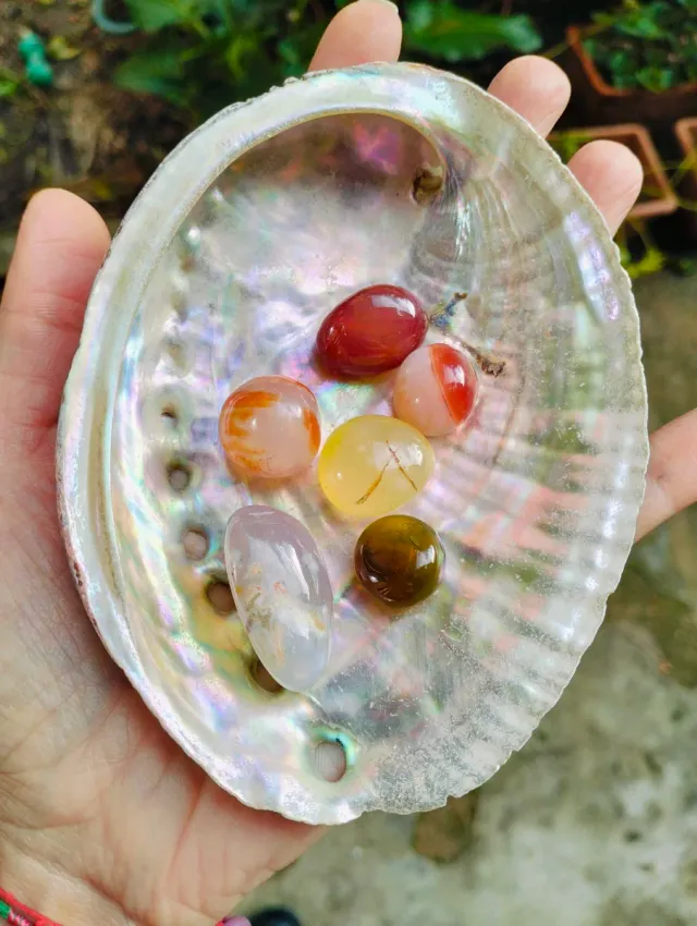 Dettagli del prodottoBellissima conchiglia di abalone con sei pietre naturali.