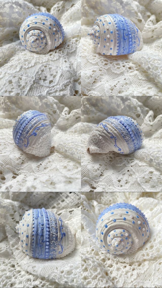 Conchiglia decorata a mano con dettagli in blu e bianco. - Decorazione dipinta a mano. - Motivi rialzati - Disegni stilizzati.