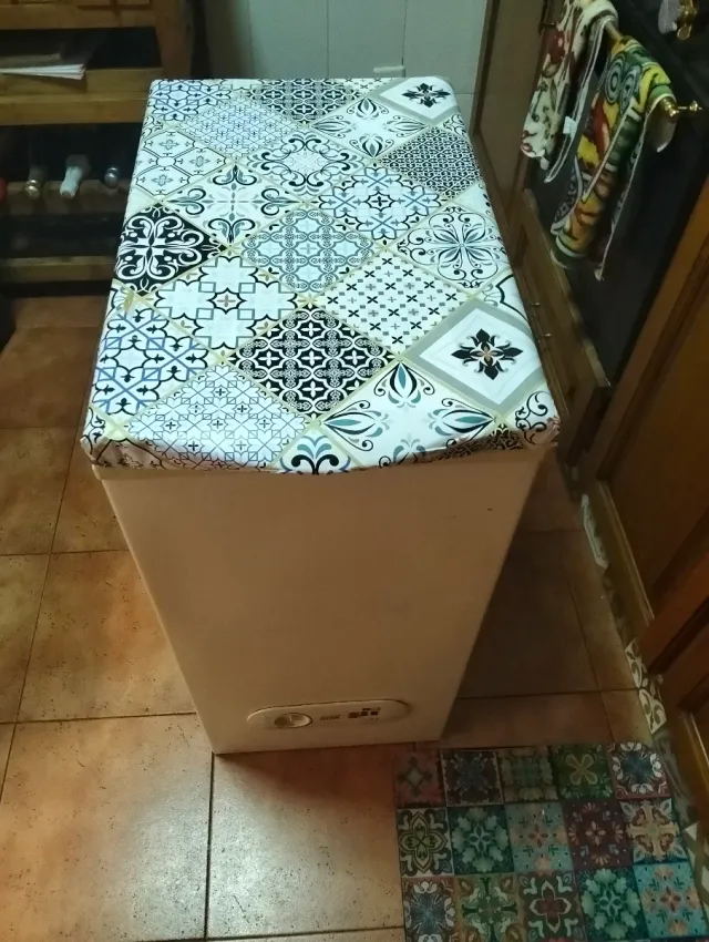 Dettagli del prodottoCongelatore a pozzetto di colore bianco. Il coperchio superiore è ricoperto da un protettore decorativo con design a piastrelle. Design moderno e funzionale. Protettore del coperchio con stampa geometrica. La descrizione è stata tradotta automaticamente.