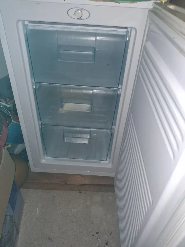 Congelatore verticale di colore bianco con tre cassetti. Design compatto. Maniglie integrate nei cassetti.