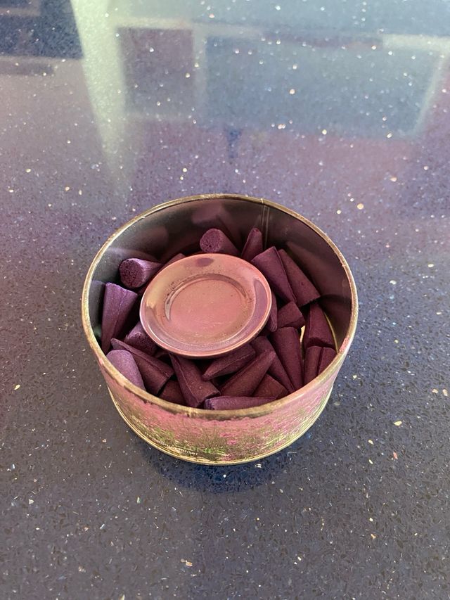 cofanetto di metallo, con circa una 40 coni di incenso profumato alla lavanda. Contiene anche il piattino di ceramica per poggiare i con